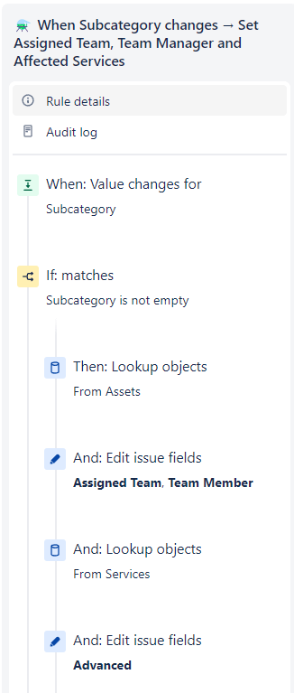 ⚗️ When Subcategory changes → Set Assigned Team, Team Manager and Affected Services