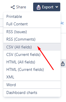 The customer has several custom fields and doesn’t want to import all of them into the cloud. So we create a filter with the same JQL provided in the first script “project in (TEST, TAT) ORDER BY key ASC“, and download the CSV with the fields but without the comments and attachments.