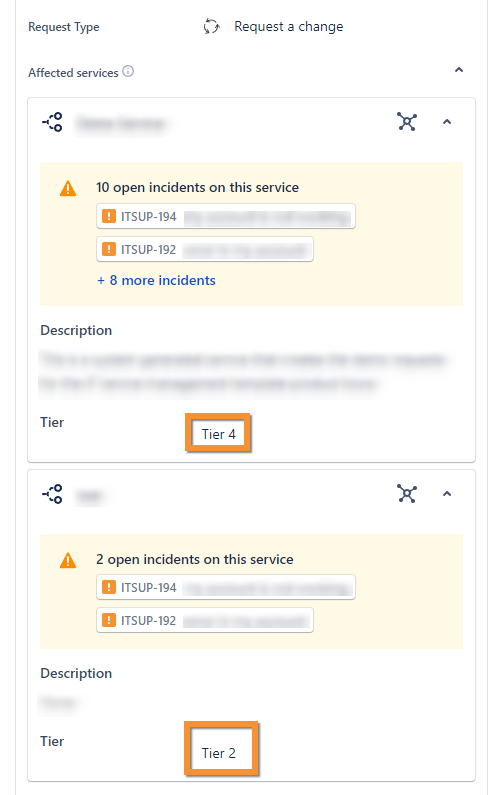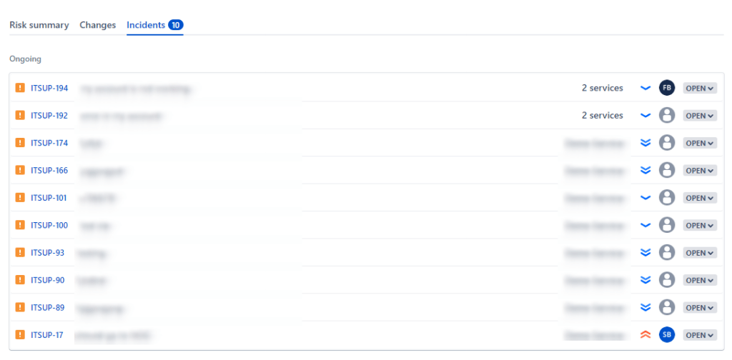 You will be able to view a list of open incidents related to the affected service, including the service tier.