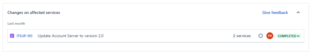 It displays the issue key of the change, the list of services that are affected by the change, as well as the status of the change.