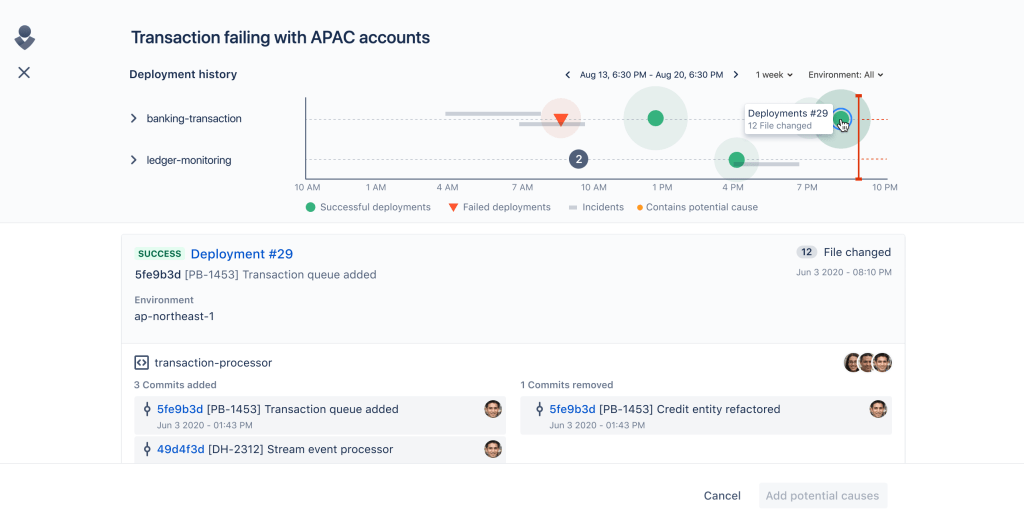 If you are using the Bitbucket platform for project management and your team is performing deployments through this tool, you have the ability to investigate the possible deploys that may be impacting a specific service by checking the timeline presented by the module.