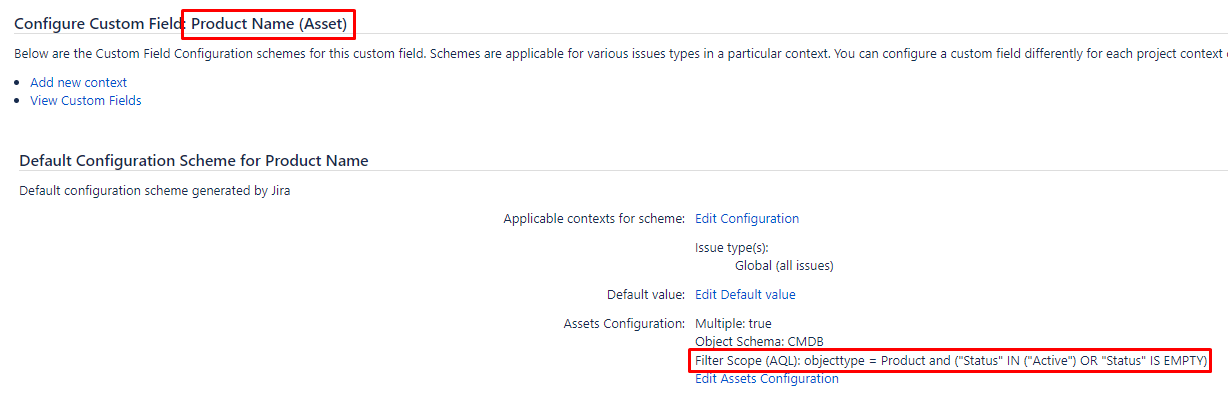 - You will also need to create a custom field of the Assets type, in which the configuration will list all Products with the IQL: objecttype = Product and (“Status” IN (“Active”) OR “Status” IS EMPTY). This field will list all the products stores in the Assets tables.