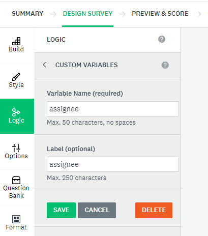 Custom Variables are present within the “Logic” link in the construction of your survey, as shown in the image below:
