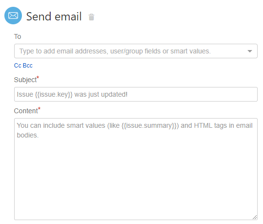 - In the email template, you can use Jira’s smart values to capture the required information. Here’s an example template: