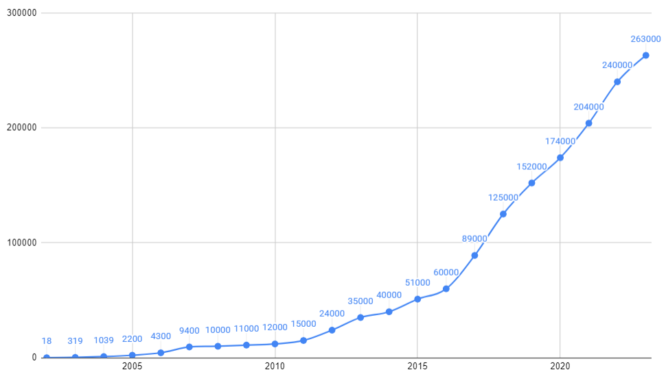 The chart below depicts the number of customers that Atlassian has accumulated since its inception, year after year (I have included the approximate value from various sources).