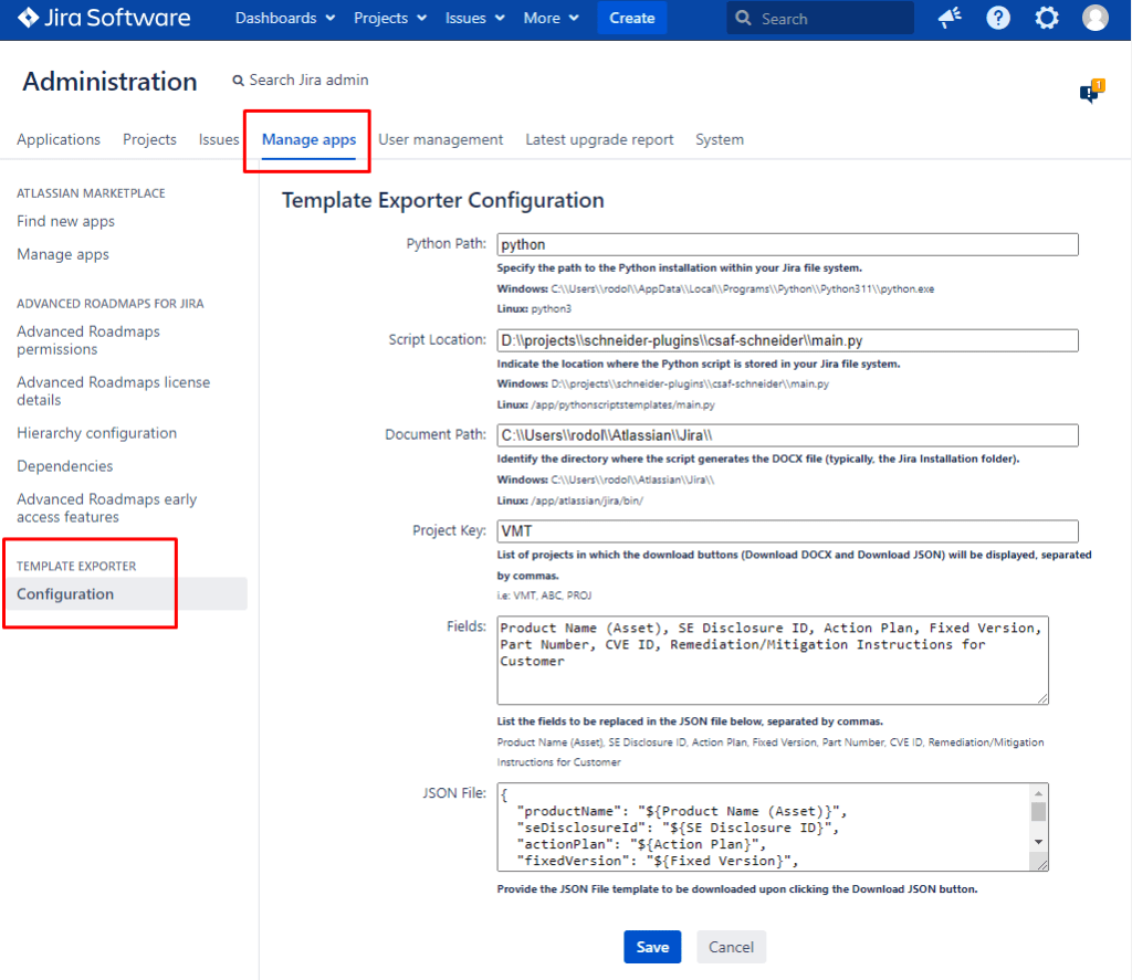 Python Path: As the DOCX file was generated by Python, I had to install it within the Jira Data Center server, and within this variable, I store how I execute any Python script within the system, in this case on my localhost, simply by calling “python”.