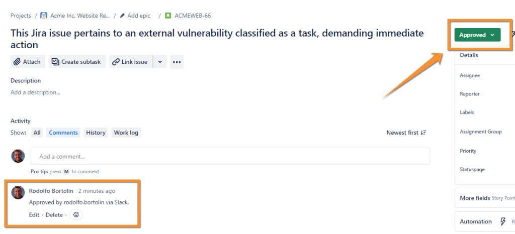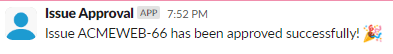 You can click Approve, and behind the scenes, Slack will send a webhook to the Lambda function, and perform the transition to the Jira issue. If successful, it will also create a comment with the user who clicked the button in Slack and modify the message in Slack saying that the issue was approved or reject.