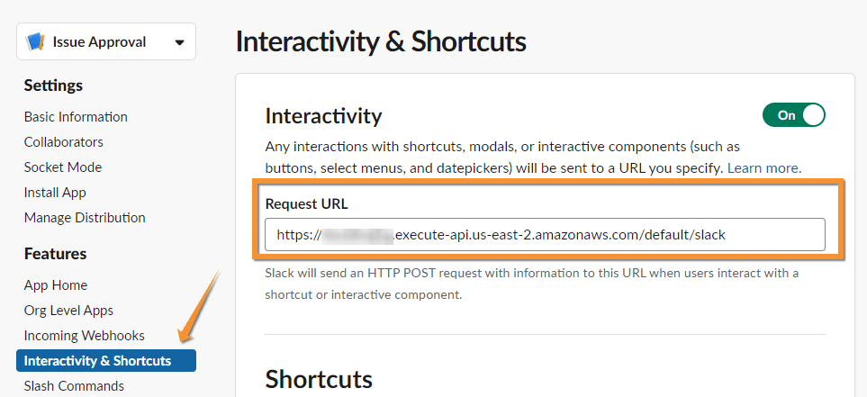 - Go back the plugin administration (in Slack) and click on Interactivity and Shortcuts.