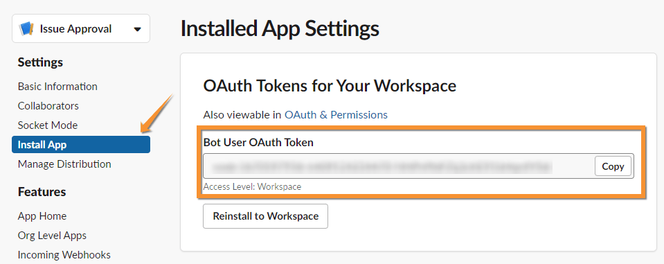 - Click the “Install to Workspace” button to install your app to the selected workspace. This will give you the