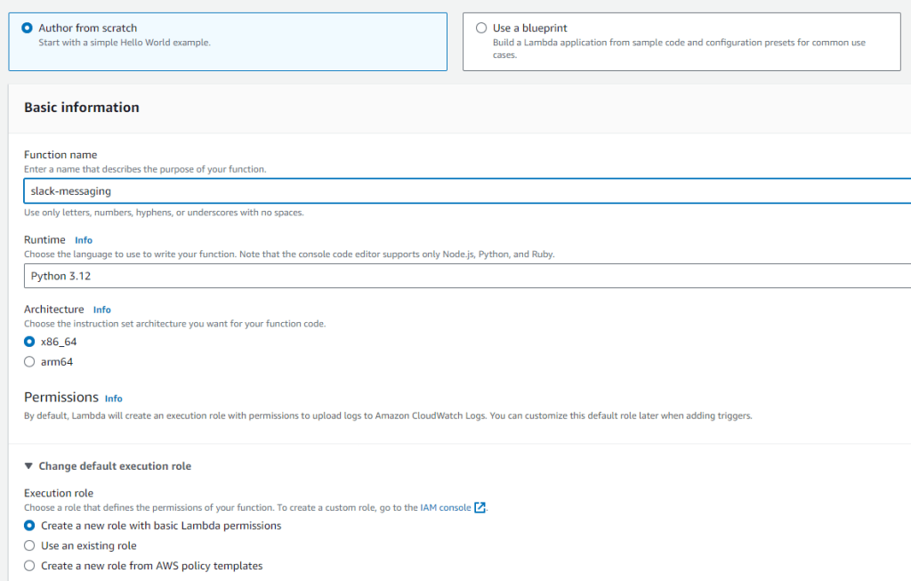 - Choose “Author from scratch” and provide a name for your Lambda function.