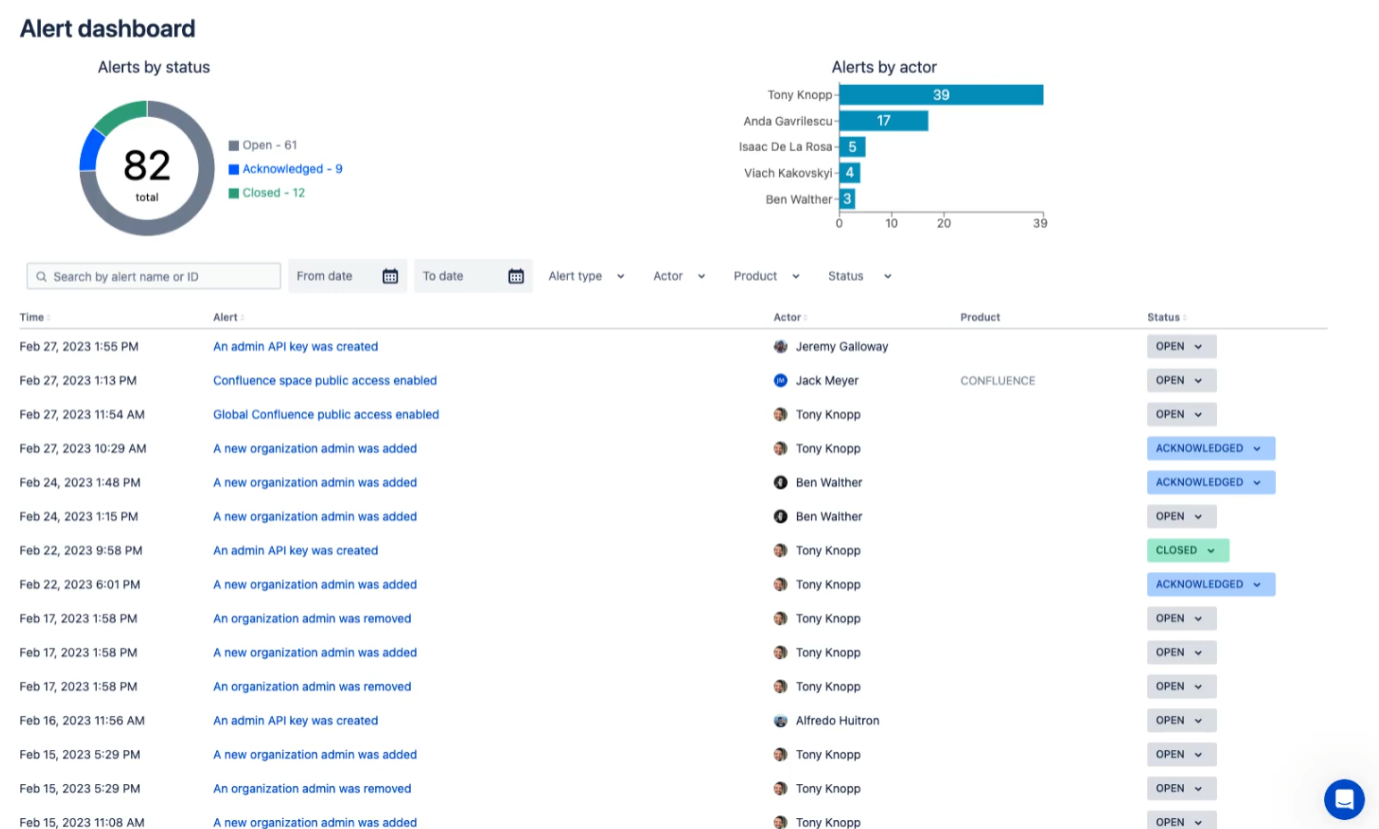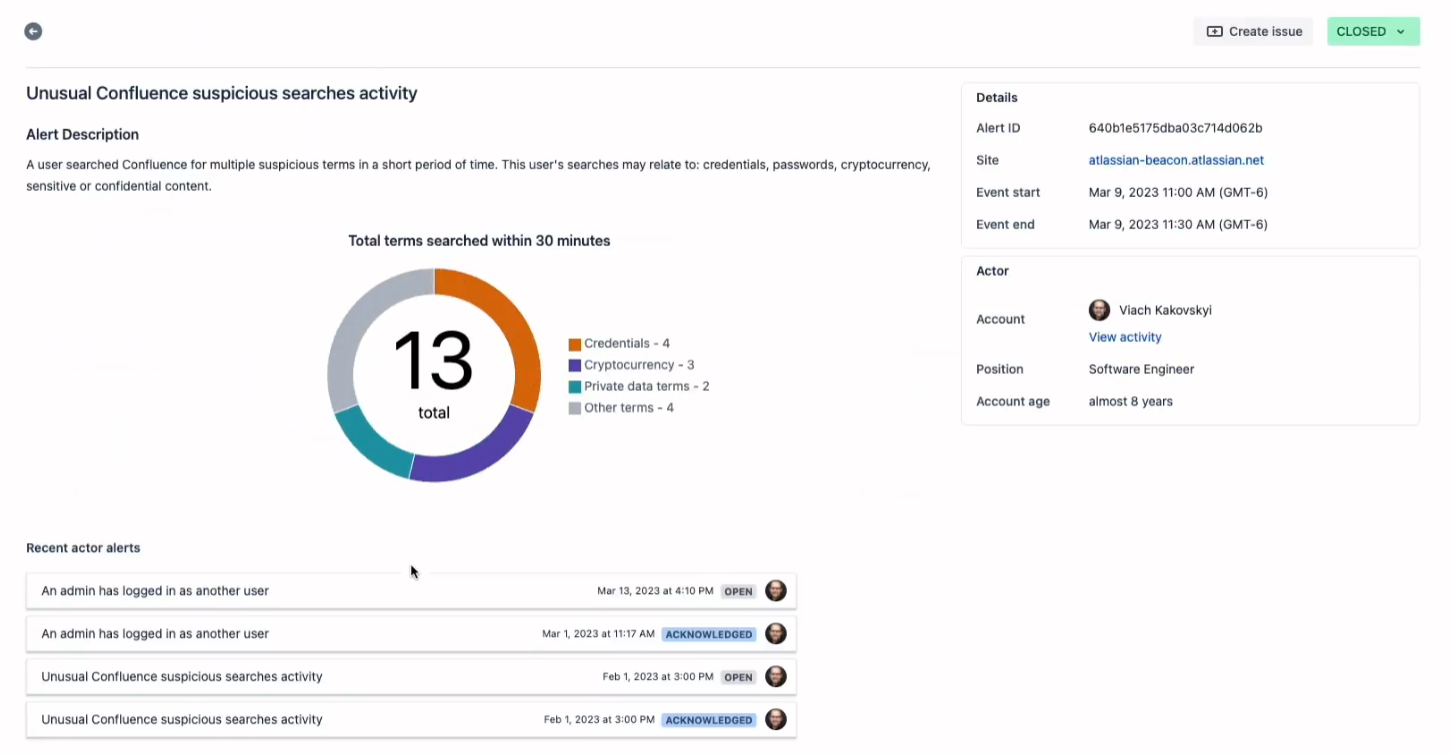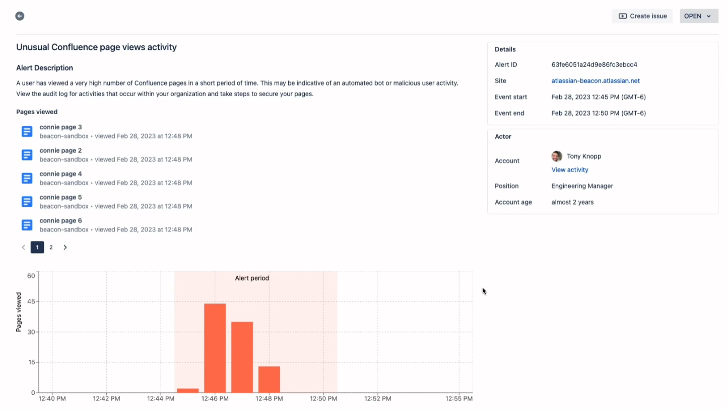 Atlassian already prides itself on delivering world-class security and reliability, ensuring that your data remains safeguarded. Beacon takes it a step further by adding an additional layer of intelligence over your Atlassian Cloud products. It continuously monitors your environment and automatically alerts you when it detects suspicious or unusual user activities. These alerts cover a range of critical areas, including: