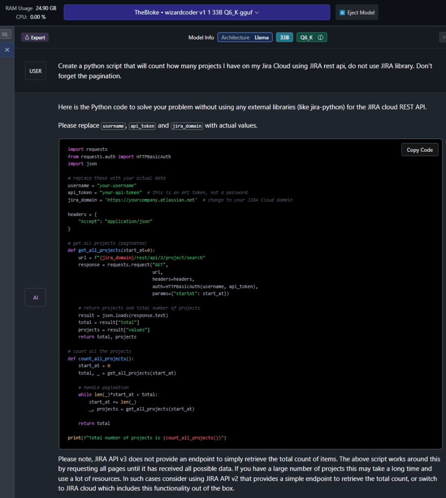 Here is a basic example and prompt performed for the model TheBloke/WizardCoder with 33 billion parameters on my local machine, without any internet connection.