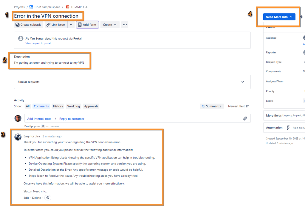 - The ticket transitioned to ‘Need More Info’ status successfully because it lacked sufficient information for the agent.