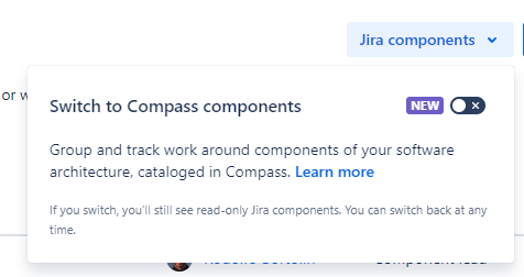 To enable Compass Components to the project, go the the Components page of the Jira Software project, in the top right corner, you will have the option to use Compass Components instead of Jira Components: