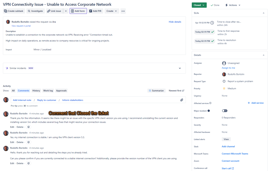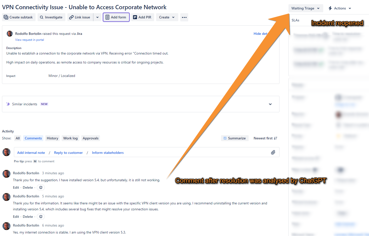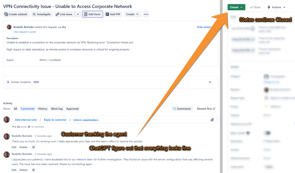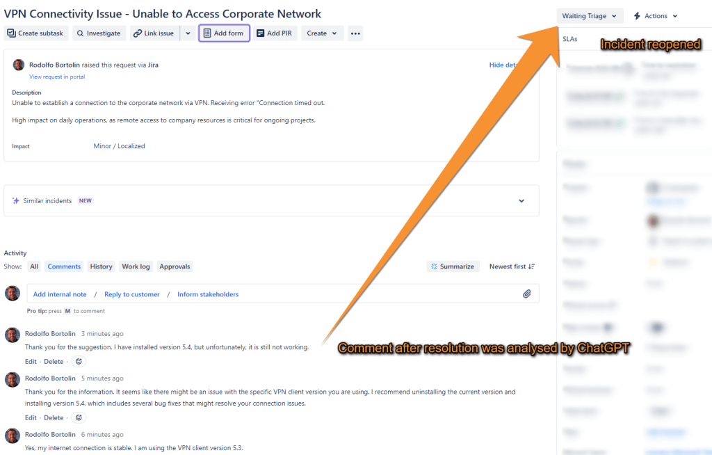 Step 2: Customer replies saying that it still not working, ChatGPT checks the comment and replies with REOPEN, Automation detects the string and Reopens the ticket.