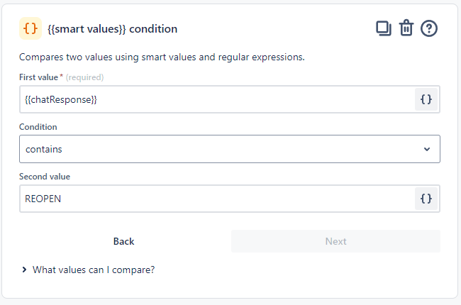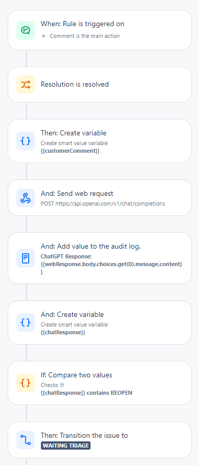 {{chatResponse}}variable contains the word “REOPEN.” - Then: Transition the issue to – If the condition above is true, the issue is transitioned to the “WAITING TRIAGE” status, which indicates that the issue needs to be reviewed or re-evaluated.