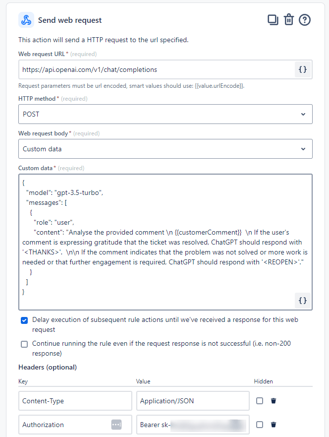 {{customerComment}}. This variable will store the content of the comment that triggered the rule. - And: Send web request – The rule sends a POST request to OpenAI. AI evaluates customer comment, if AI identifies that the customer is satisfied with the resolution of their issue, it responds with