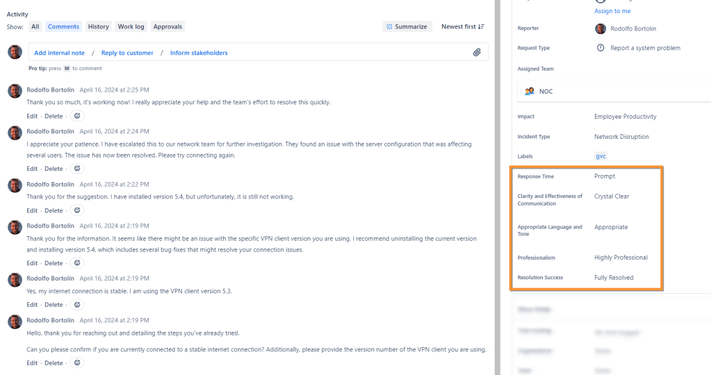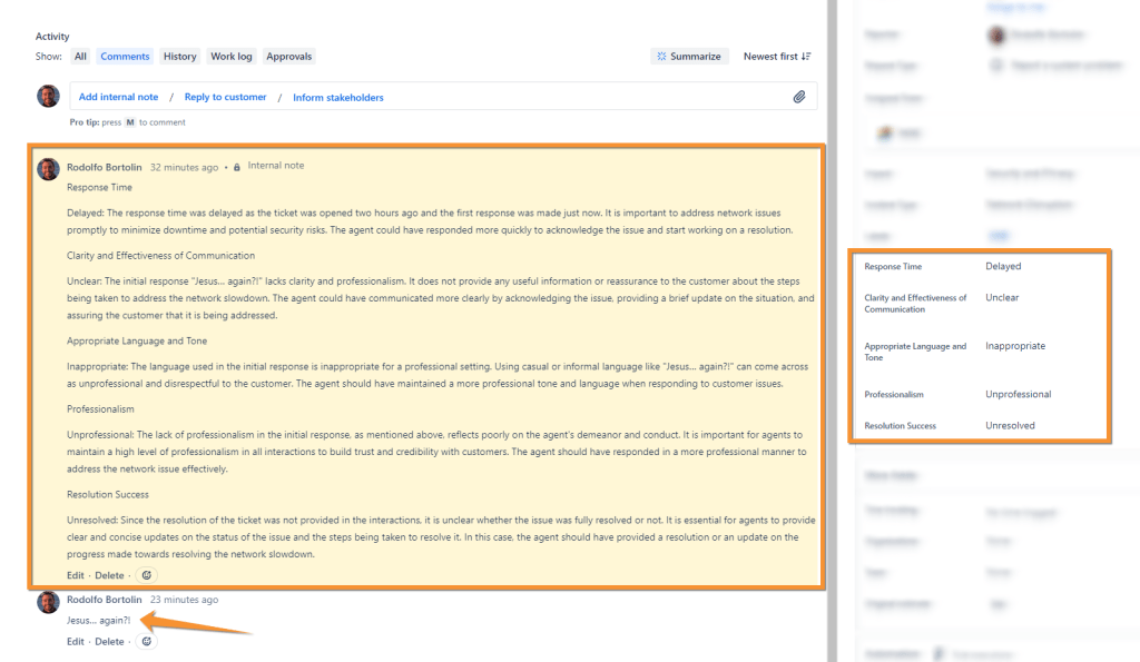 Artificial Intelligence can significantly enhance the evaluation of customer-agent interactions by automating the process and providing more precise and unbiased insights. Specifically, I have developed an automation that analyzes all interactions between agents and customers based on criteria stored in custom fields as select lists in Jira. As soon as a ticket is resolved, this automation is triggered to evaluate the interactions using these criteria, and the results are populated in the custom fields.