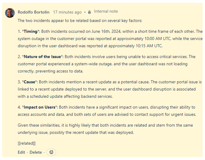 Comment added to the incident that triggered the rule, saving the response from OpenAI as a internal note explaining why the incidents are correlated.
