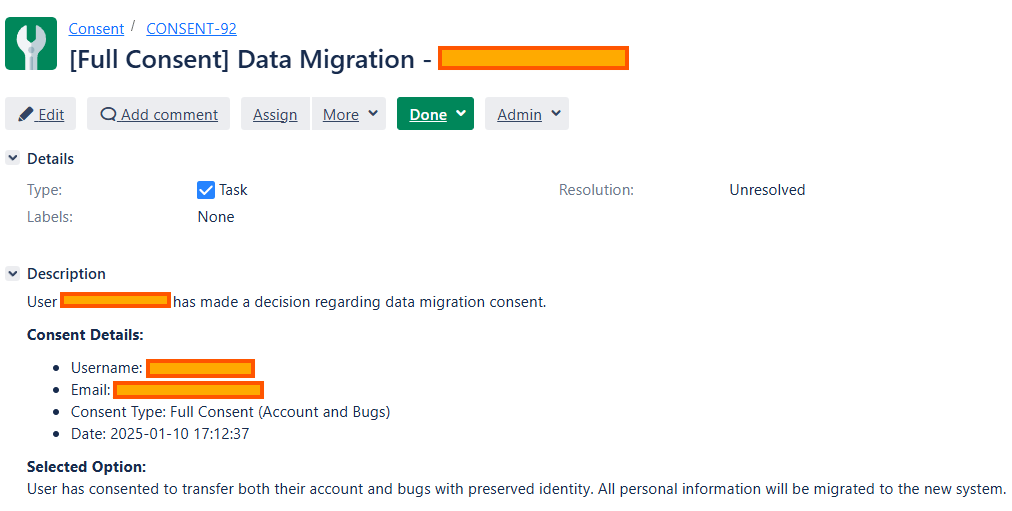 A new issue is automatically created in a dedicated “Consent” project to track each user’s decision. This issue includes: